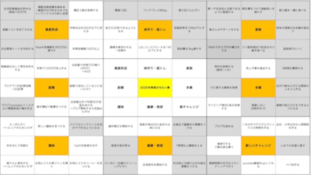 最後はメンタル面です。大谷翔平選手が実践していたことでも有名な「目標達成シート」を参考に、来年の計画を立てます。